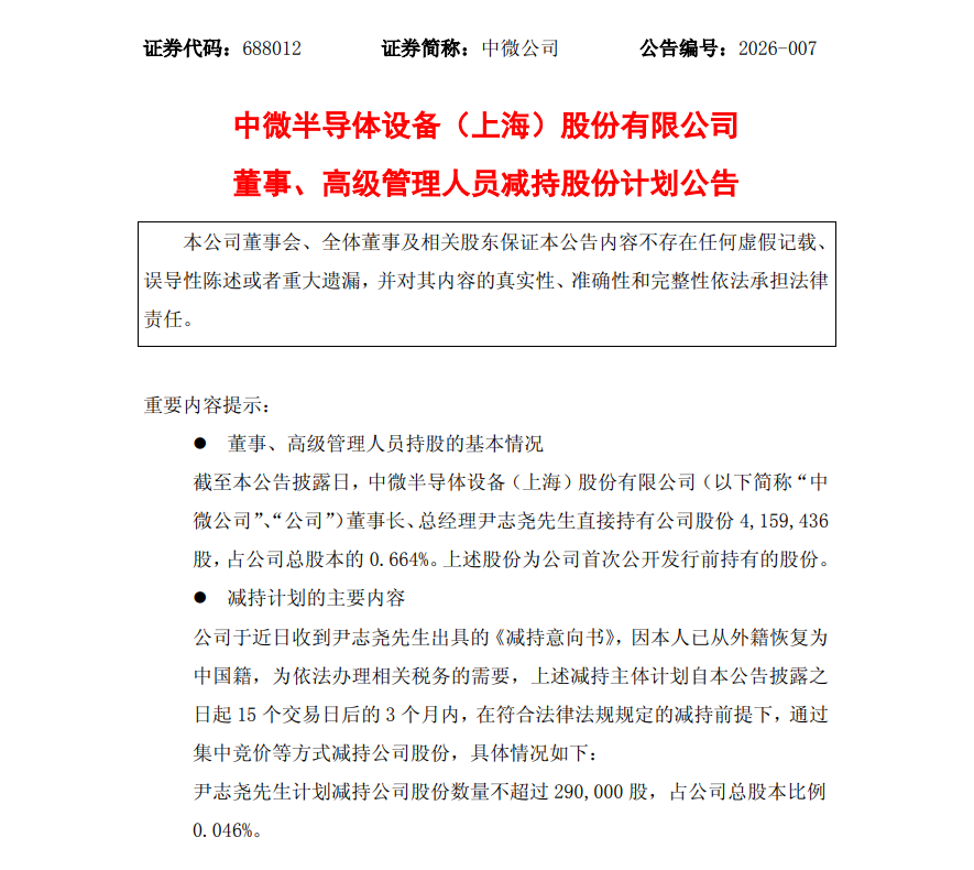 A股半导体设备领域龙头中微公司(688012)发布的一份减持公告引发广泛关注。