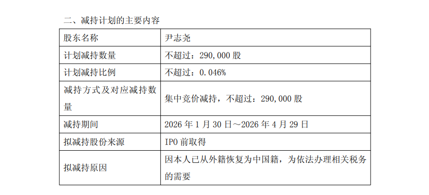 公告显示,公司于近日收到公司董事长、总经理尹志尧出具的《减持意向书》,尹志尧计划减持公司股份数量不超过29万股,占公司总股本比例0.046%。尹志尧本次减持原因为:因本人已从外籍恢复为中国籍,为依法办理相关税务的需要。
