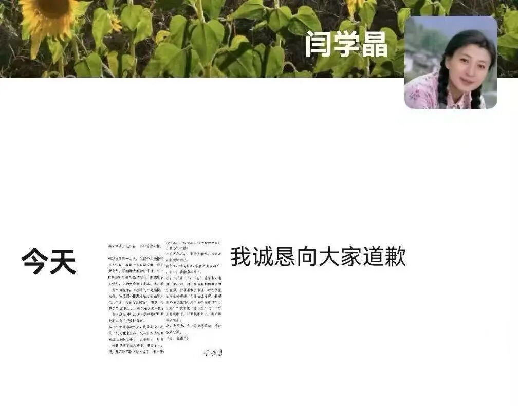 闫学晶在微信朋友圈发文致歉。