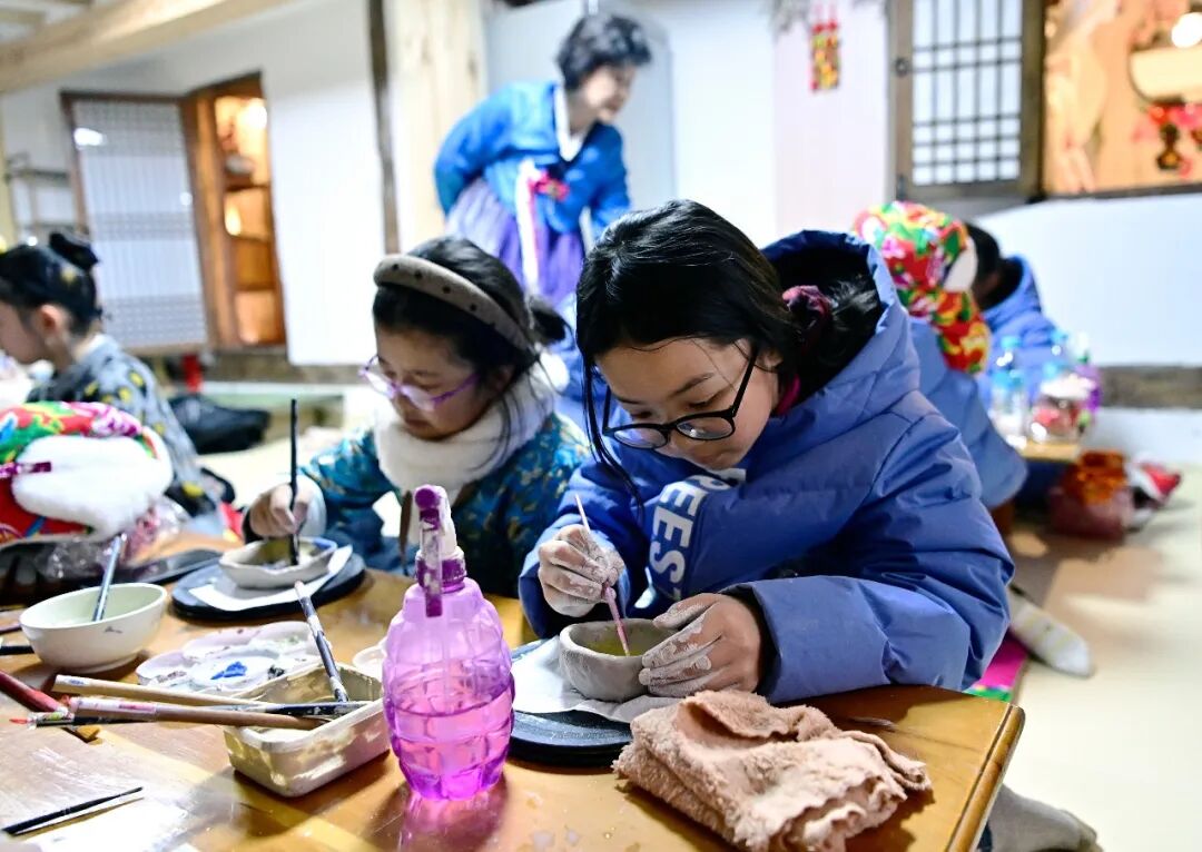 11时,两地学生一起来到民俗园陶艺工坊和传统米糕体验馆。在陶艺工坊里,学生们亲手尝试制作陶器,感受泥土在指尖的细腻变化。在米糕体验馆弥漫的阵阵米香中,学生们围在桌前,学习如何制作传统打糕。在手工合作中,两地学生不仅体验了朝鲜族的传统手工艺,更加深了彼此的友谊。