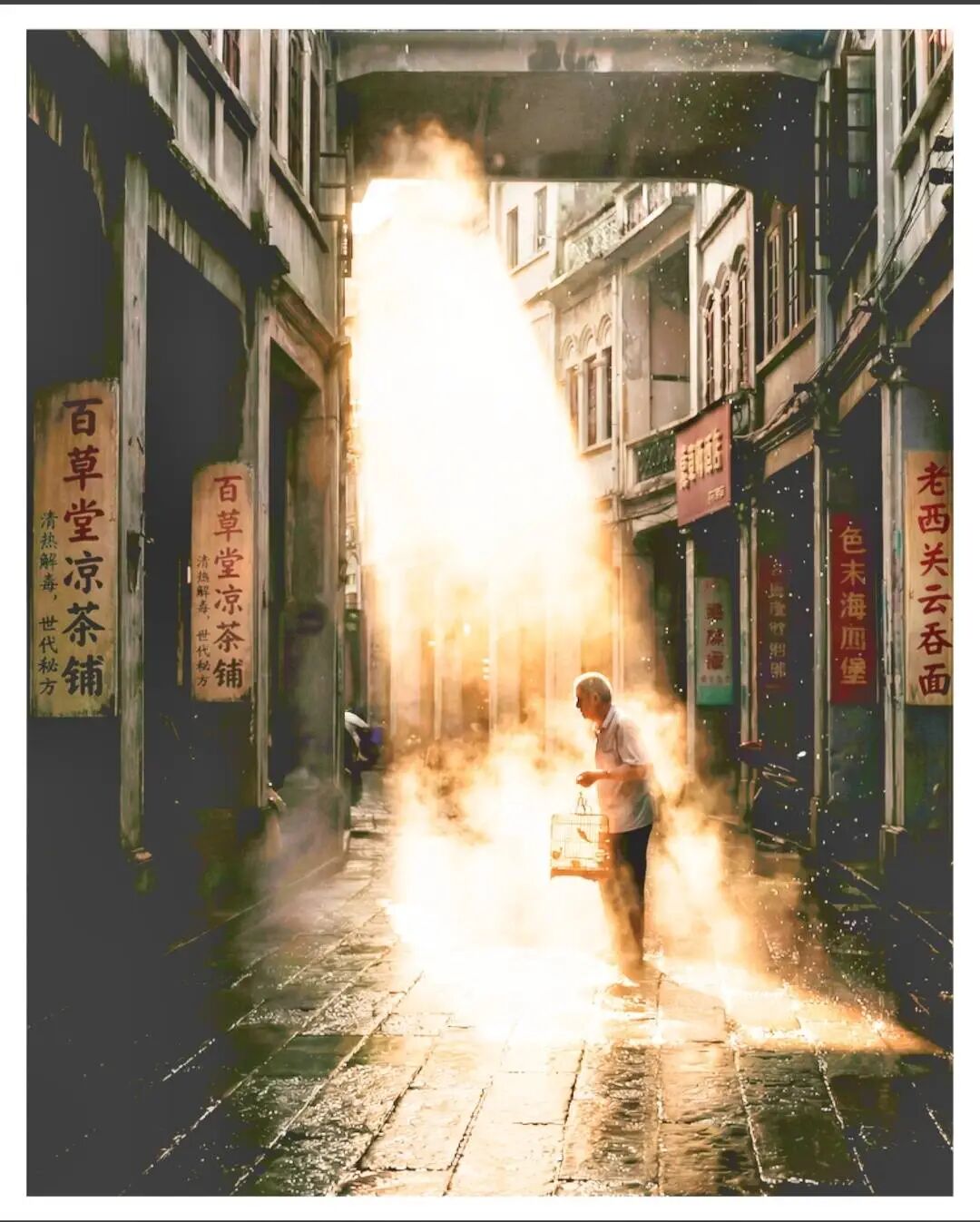 根据该网友所说,记者找到第42号作品《骑楼旧光》原图,将亮度调大并将曝光调到过量曝光,明显看到图片右侧的数个牌匾出现字体错乱和字体生成不全。该网友称,这是Al生成图片的常见错误,一眼就可辨别图片是AI生成的。还有其他例如老人提鸟笼的手指跟手掌连不起来、左侧连续两个凉茶铺牌匾之类的露馅细节。