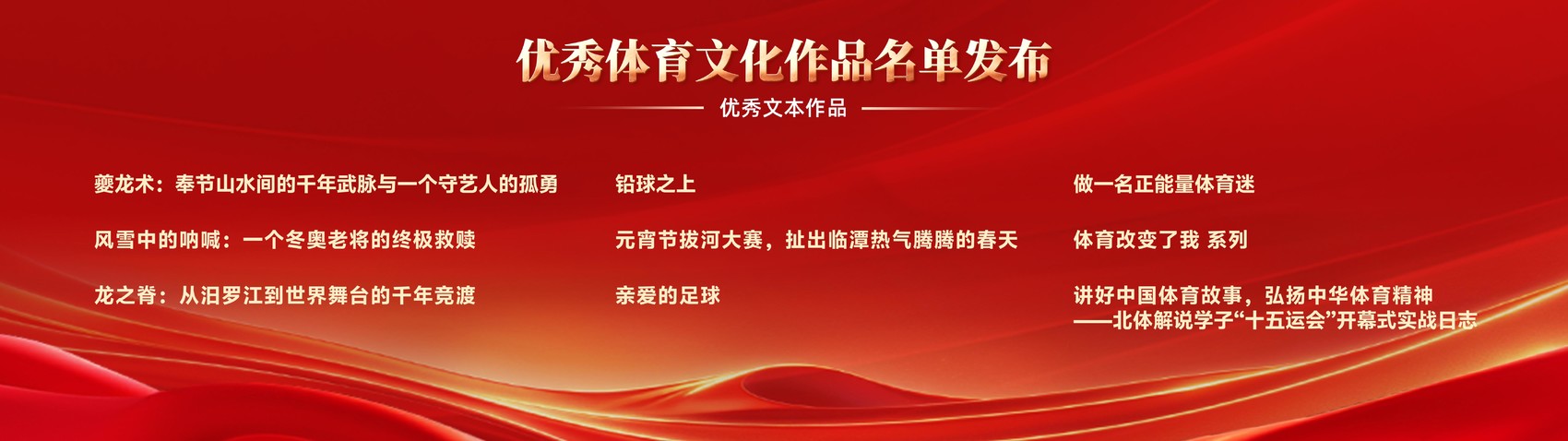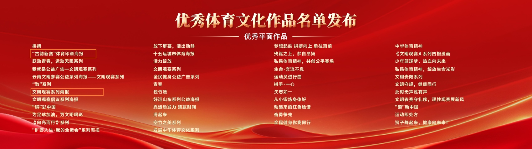 2025年6月,中宣部文明培育局与国家体育总局宣传司、国家广播电视总局传媒机构管理司共同发起体育公益广告和中华体育故事征集活动,征集到8000余件作品,经过严格公正审核遴选,确定推介《中华体育精神宣传片|加油中国!》《青年节感受体育力量 你可以一直相信这届年轻人》《中国功夫》系列双语微纪录片等120件优秀作品。