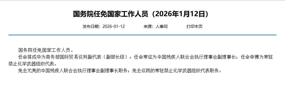 任命蒋成华为商务部国际贸易谈判副代表(副部长级);任命常征为中国残疾人联合会执行理事会副理事长;任命申博为常驻禁止化学武器组织代表。