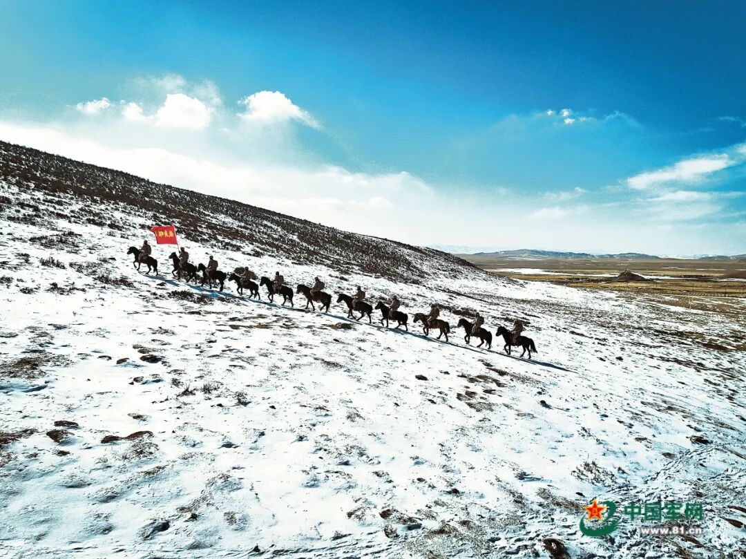 哨所官兵骑马踏雪巡逻。