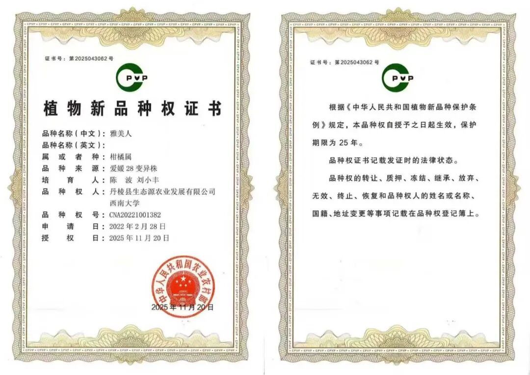 近日,由丹棱县自主选育的柑橘新品种“雅美人”正式通过农业农村部登记认证,获得植物新品种权。这是丹棱县持续推进柑橘品种差异化创新、提升产业核心竞争力的又一重要成果,丹棱县再增具有自主知识产权的柑橘新品种。