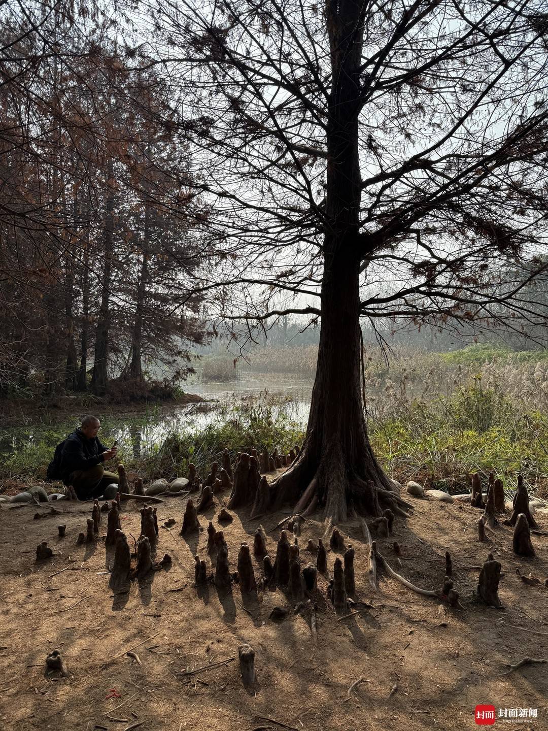 12日上午,记者来到青龙湖湿地公园,按照网友标记的位置,步行20多分钟,找到了这片“神仙树”。这片树林靠近水边,走进去,数十名游客围在一起,观察地面上冒出的一片树根,并拍照、合影。
