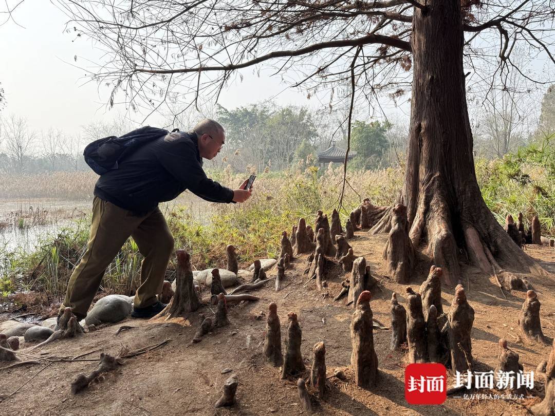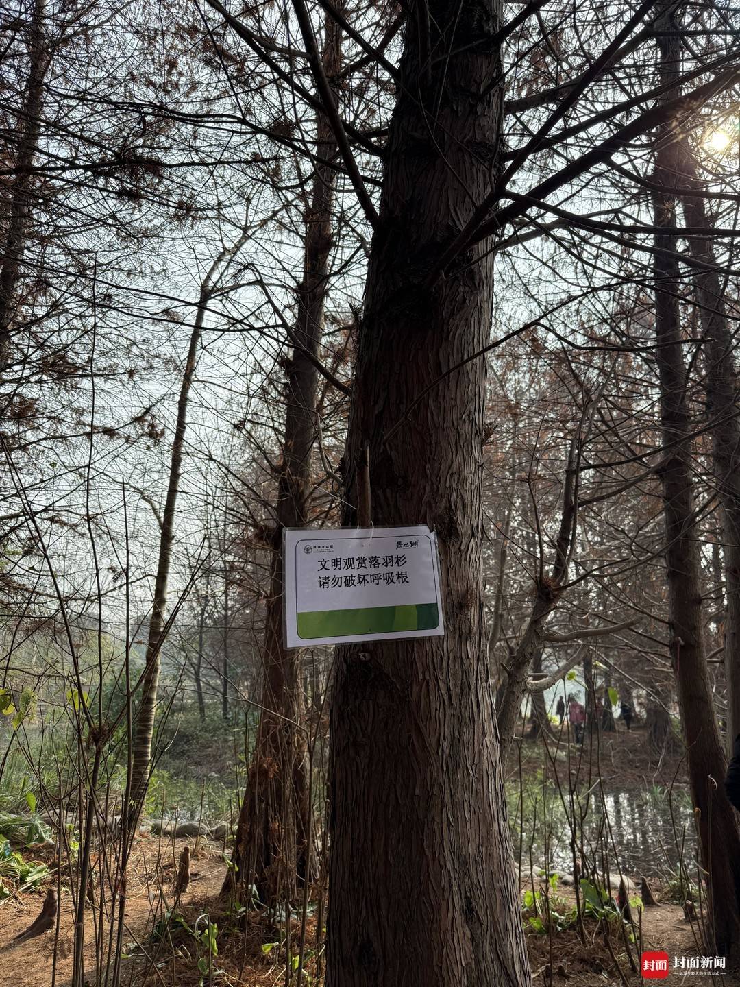 记者注意到,现场一棵树上挂着提示牌,写着“文明观赏落羽杉,请勿破坏呼吸根”,同时一旁喇叭也播放着一段提醒,“各位游客,该处为落羽杉的呼吸根,请您文明观赏,不触摸,不折断或踩踏”。