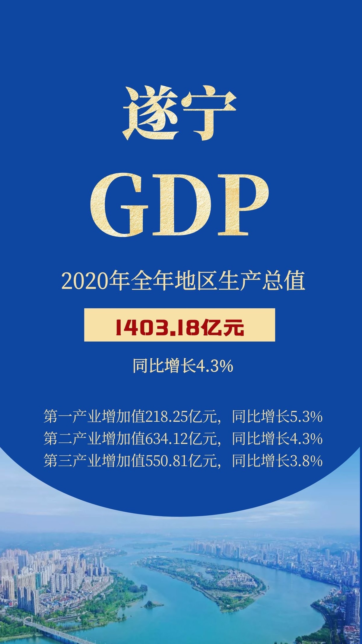 1月21日,记者从遂宁市统计局获悉,根据地区生产总值统一核算结果,遂宁全年实现地区生产总值(GDP)1403.18亿元,按可比价格计算,比上年增长4.3%,增速高于全省平均水平(3.8%)。