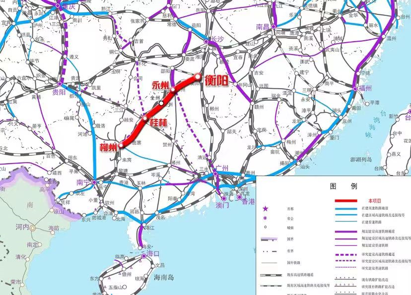 聊邯长高铁在国家中长期规划中的位置与渝贵高铁功能定位相似的南衡高铁衡阳至柳州段,是广西与长江经济带、华中以及华北地区衔接的重要通道,也是“八纵八横”呼南高铁的“补强”路段,旨在解决广西高铁北上的“速度慢”问题。
