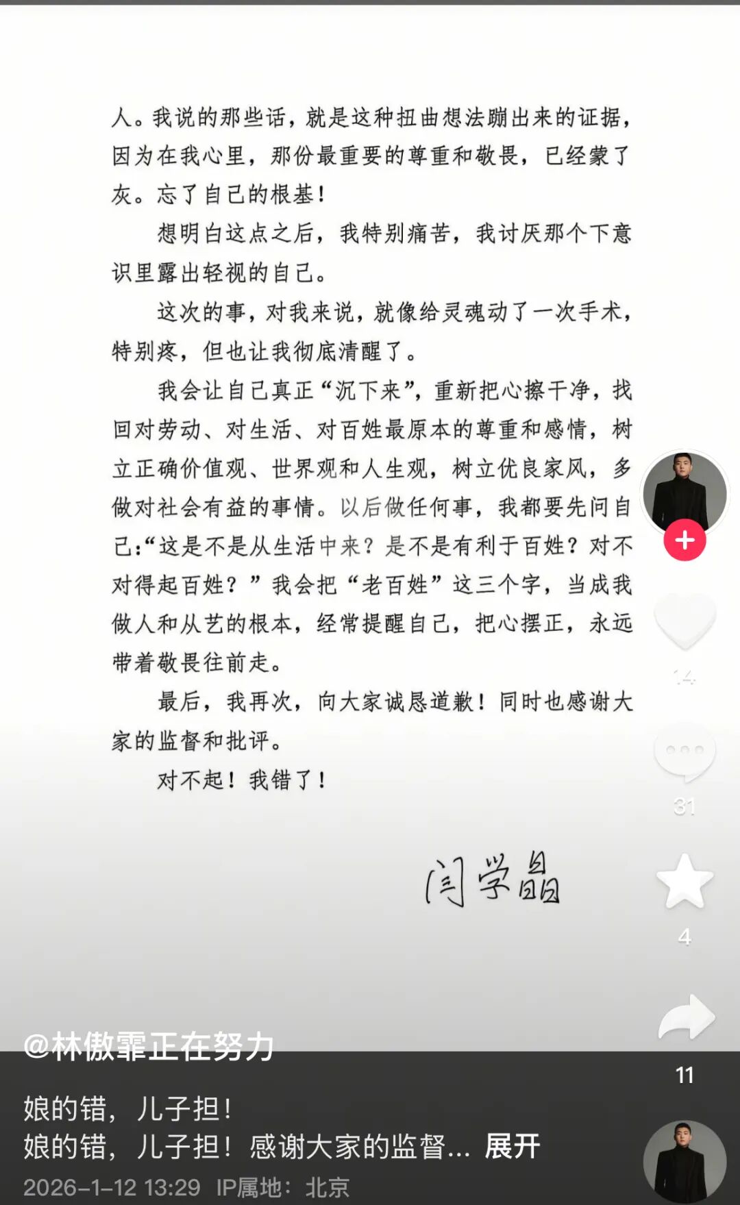1月12日,闫学晶的儿子林傲霏在个人社交媒体账号发布了其母的道歉书,并留言“娘的错,儿子担!感谢大家的监督批评!我们错了。再一次向大家真挚的道歉:对不起!”