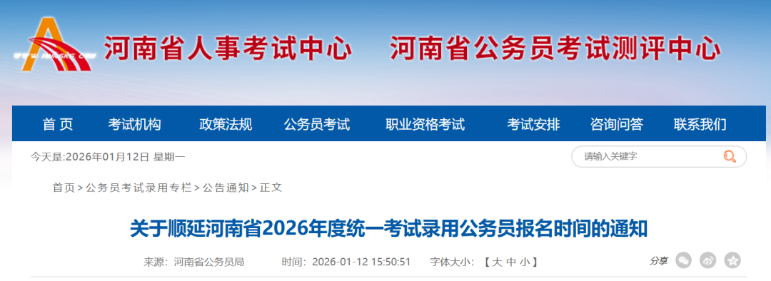 经研究,决定将河南省2026年度统一考试录用公务员报名申请提交和资格初审时间顺延48小时,即从原定截止时间1月12日17:00顺延至1月14日17:00。