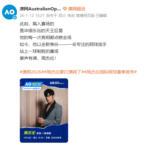 1月12日,@澳网AustralianOpen 官宣:周杰伦将以全新身份参加澳网一球制胜挑战赛,这将是周杰伦国际网球赛事首秀。