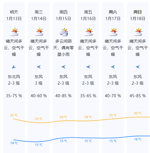 预计1月13日晴天干燥,气温14-25℃;