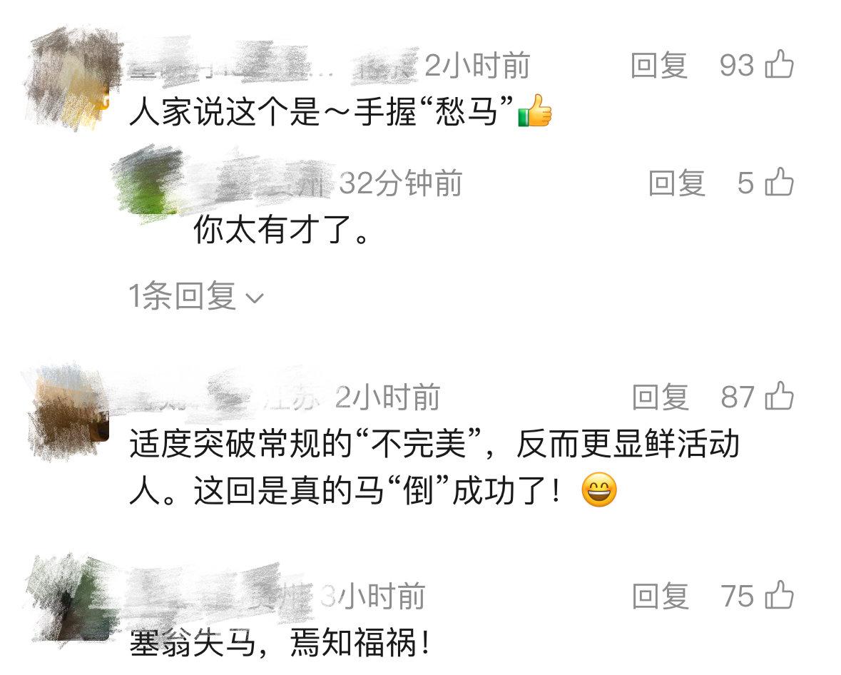 网友们还赋予它各种名字,如“不要不开心马”“周一马”“上班哭哭马,下班开心马”等。除昵称外,还有人创造出“马倒成功”“愁马(筹码)在手”的谐音梗,戏称这是现实版“塞翁失马,焉知非福”。