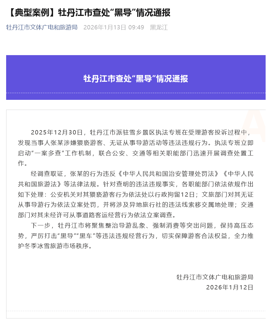 2025年12月30日,牡丹江市派驻雪乡景区执法专班在受理游客投诉过程中,发现当事人张某涉嫌猥亵游客、无证从事导游活动等违法违规行为。执法专班立即启动“一案多查”工作机制,联合公安、交通等相关职能部门迅速开展调查处置工作。