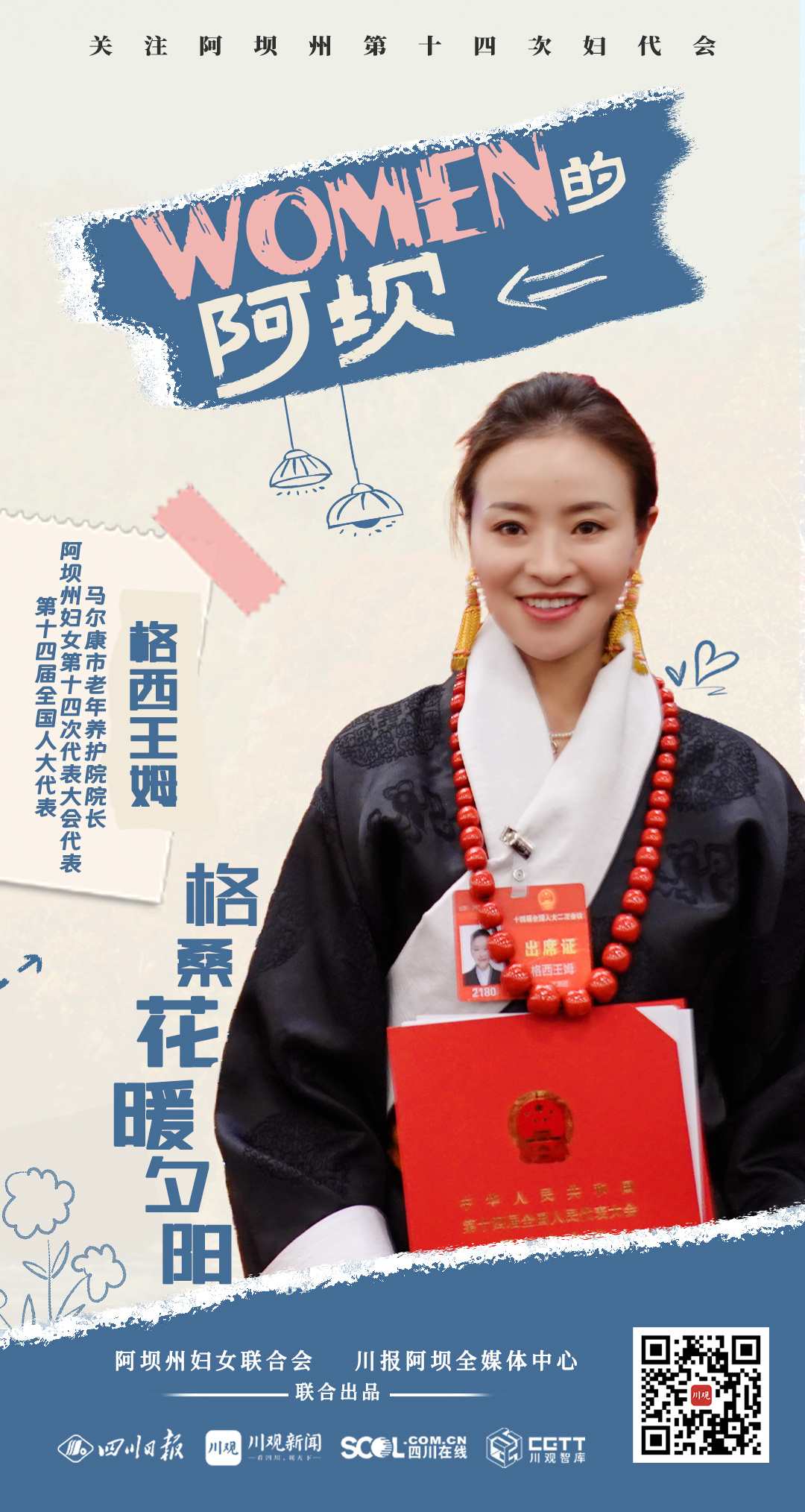 格西王姆,阿坝州马尔康市老年养护院院长,第十四届全国人大代表、阿坝州妇女第十四次代表大会代表。18岁起,她照顾老人饮食起居,为他们喂饭、擦指甲油,一起跳保健操、种蔬菜,她用细致与坚韧,成为老人口中的“贴心女儿”。担任院长后,不仅持续精进个人专业能力,更积极组织团队学习,共同提升服务水平,用实际行动回应着“一老一小”的民生关切。她曾获得“全国优秀农民工”“四川省优秀养老护理员”等荣誉。