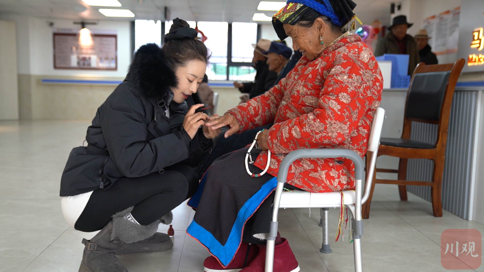 格西王姆给老人涂指甲油增加趣味。马尔康市融媒体中心供图