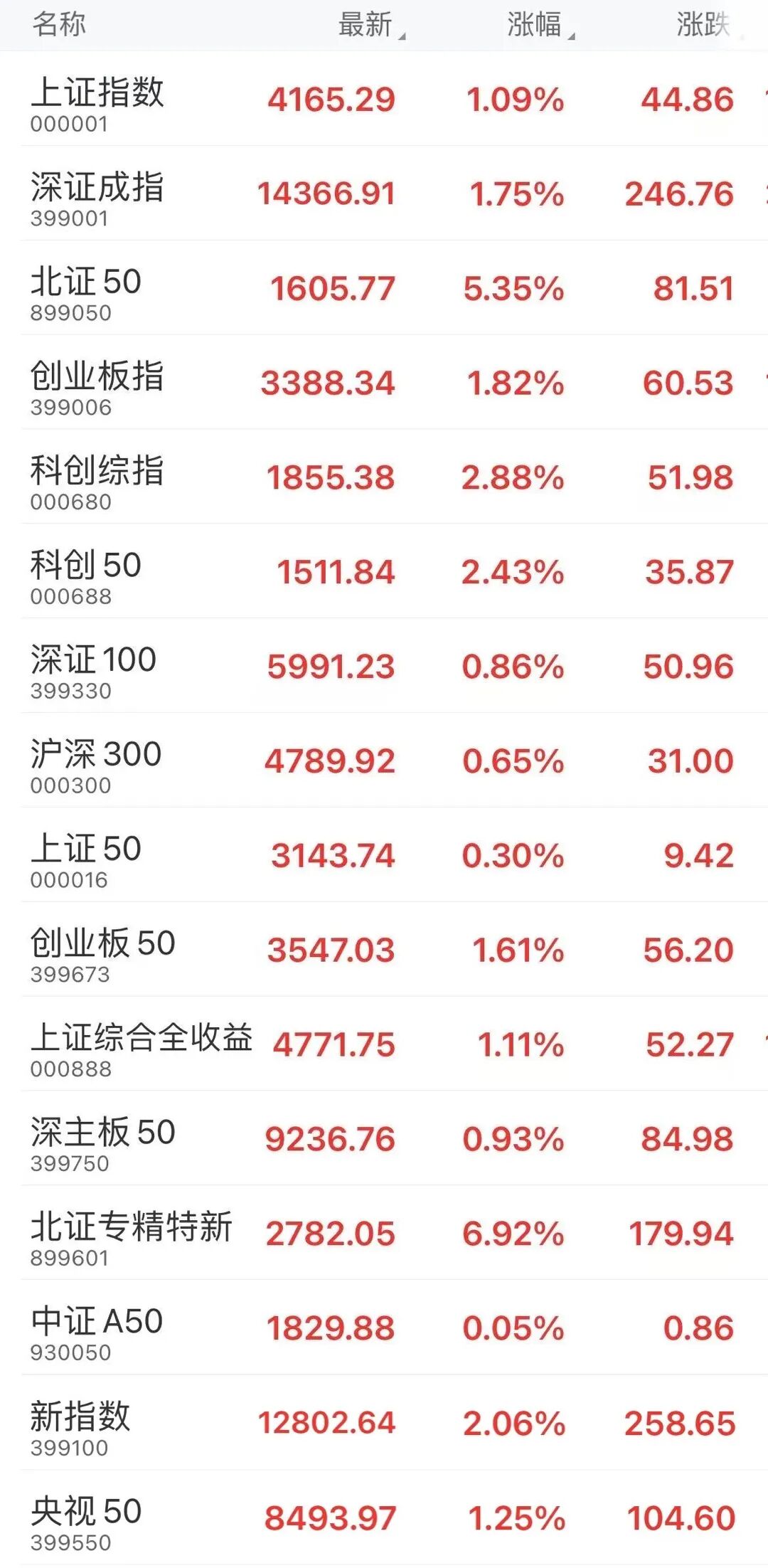1月12日,A股三大指数震荡走强。截至收盘,上证指数涨1.09%报4165.29点,深证成指涨1.75%报14366.91点,创业板指涨1.82%报3388.34点,北证50涨5.35%报1605.77点。