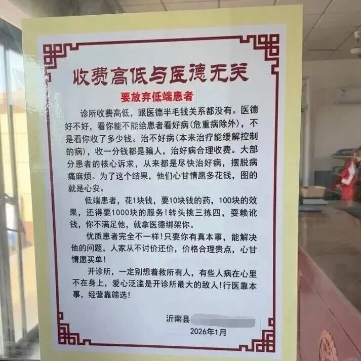 近日,山东沂南县一家中医肾脏病研究所的告示让人匪夷所思。告示给部分患者贴上“挑三拣四、耍赖讹钱”标签,称其为“低端患者”,直言“收费高低与医德无关”,甚至辩称发布告示的目的是“保护自己”......这番牛头不对马嘴、充满对立感的表述,暴露了这家医院的医德和素质,触碰了医疗行业的公益底线,甚至还涉嫌违法。