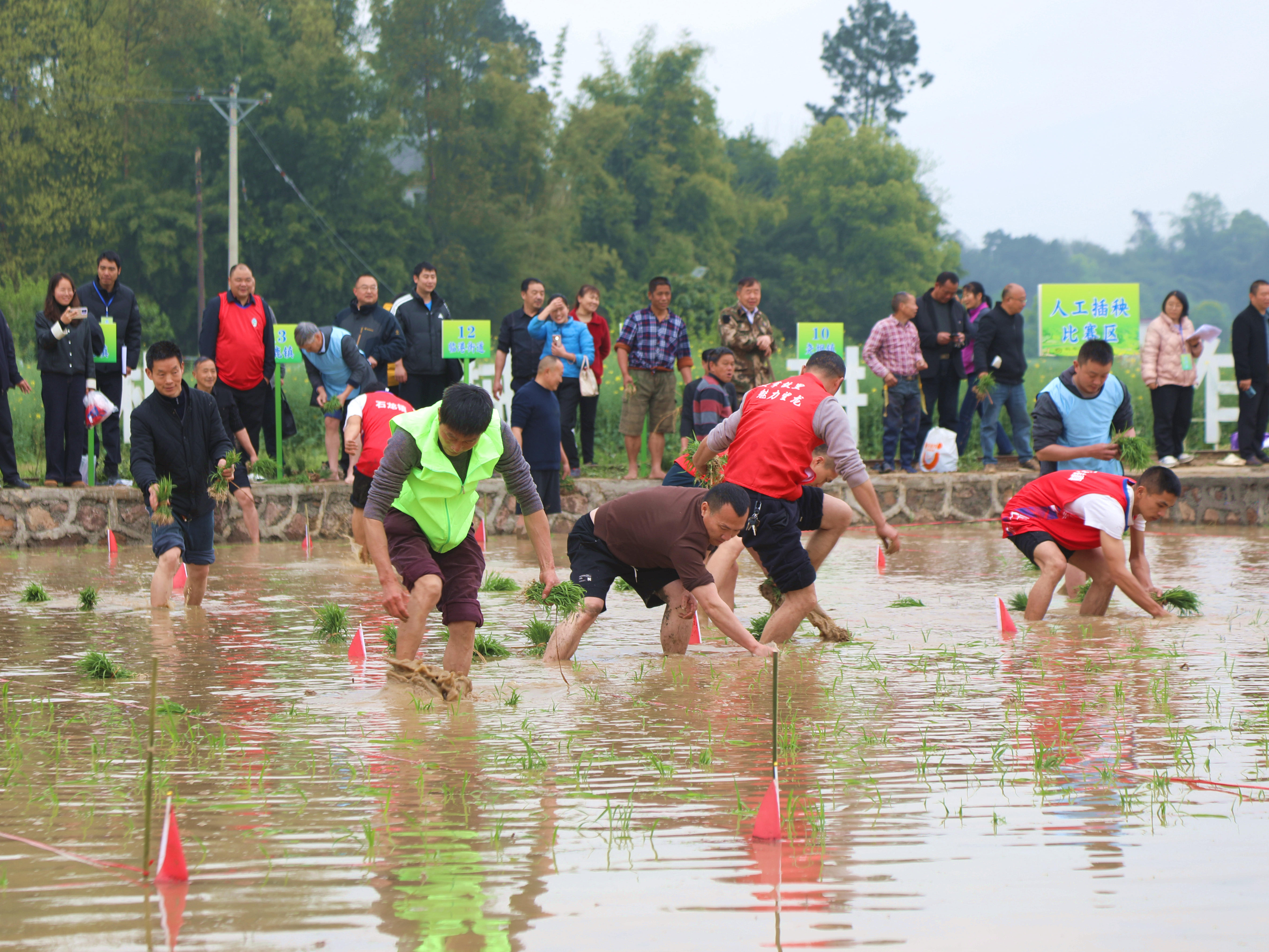 常滔(右二)安排工人安装秧盘传送设施,积极备战大春。