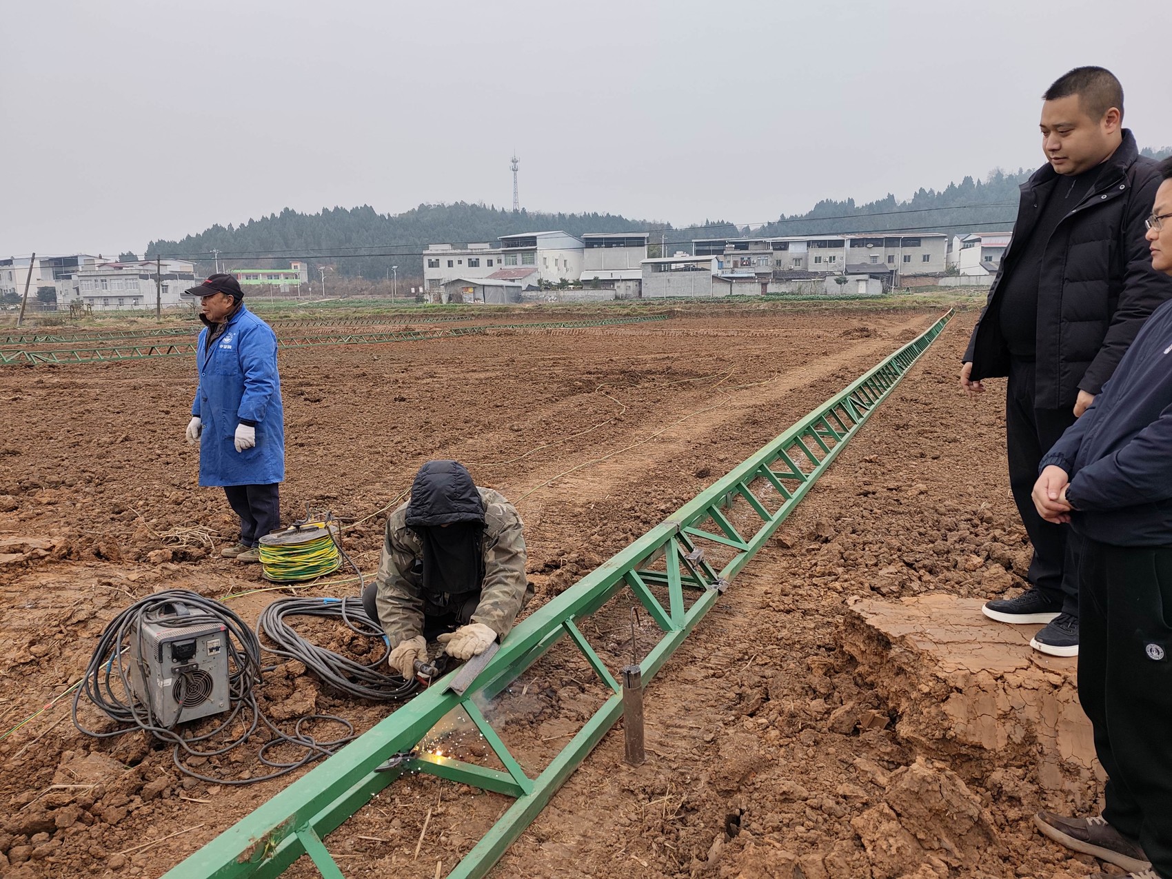 常滔(右二)安排工人安装秧盘传送设施,积极备战大春。