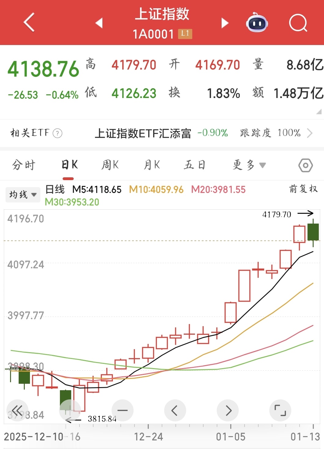 1月13日,A股连续上涨势头迎来调整,上证指数终结此前的17连阳,三大指数集体收跌。与此同时,市场交投活跃度持续攀升,沪深京三市成交额突破3.69万亿元,较昨日放量541亿元,再创历史天量,多空博弈程度激烈。