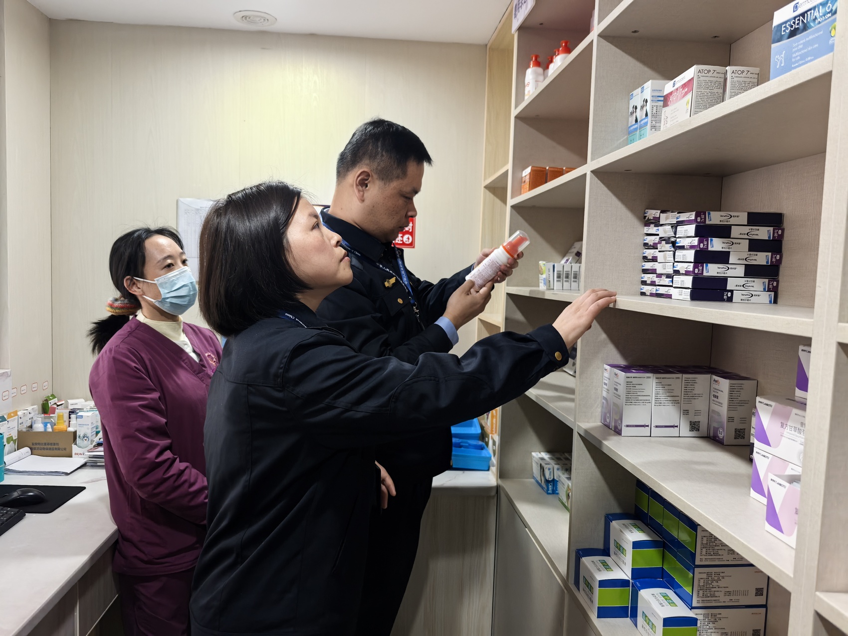 成都农业执法部门的执法人员在宠物医院检查宠物相关药品。
