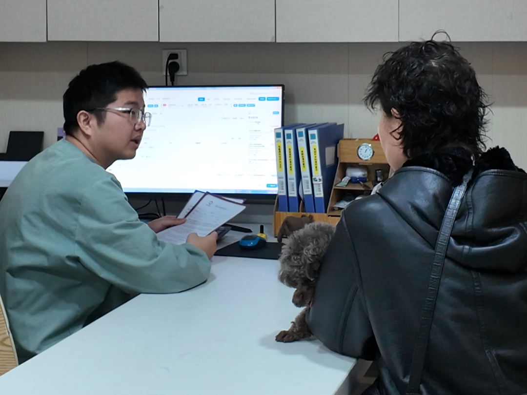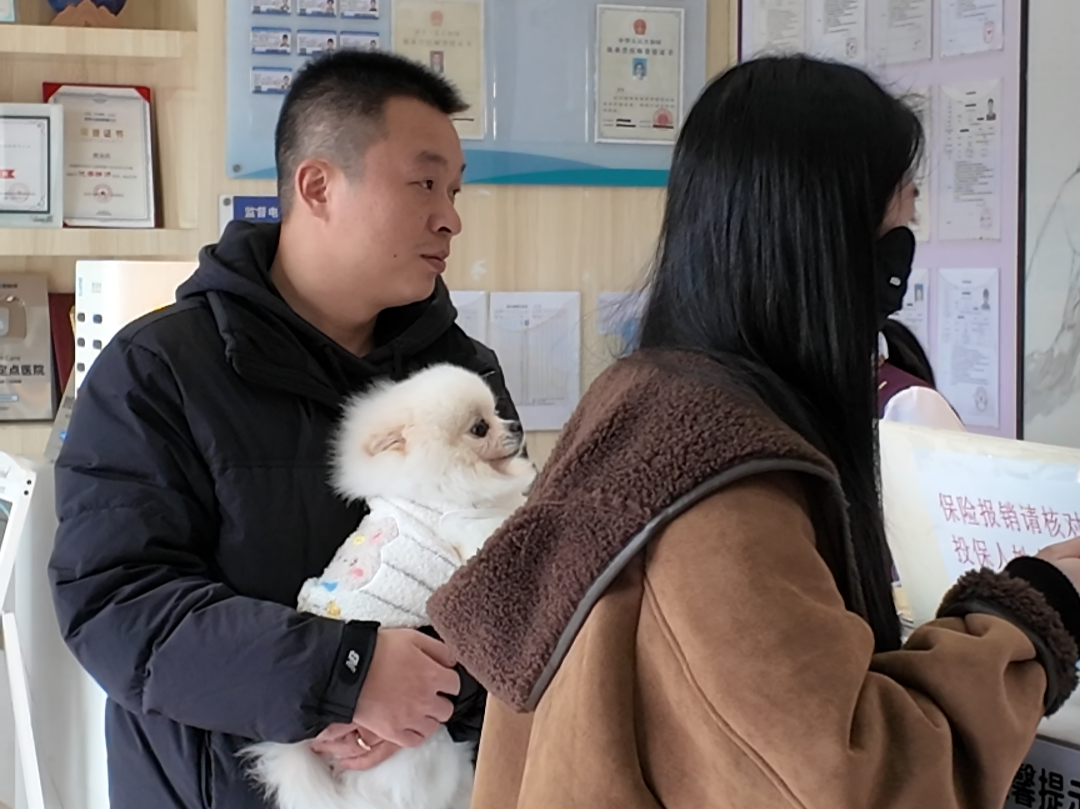 宠物医院里,一位家长正在带着“毛孩子”就诊。