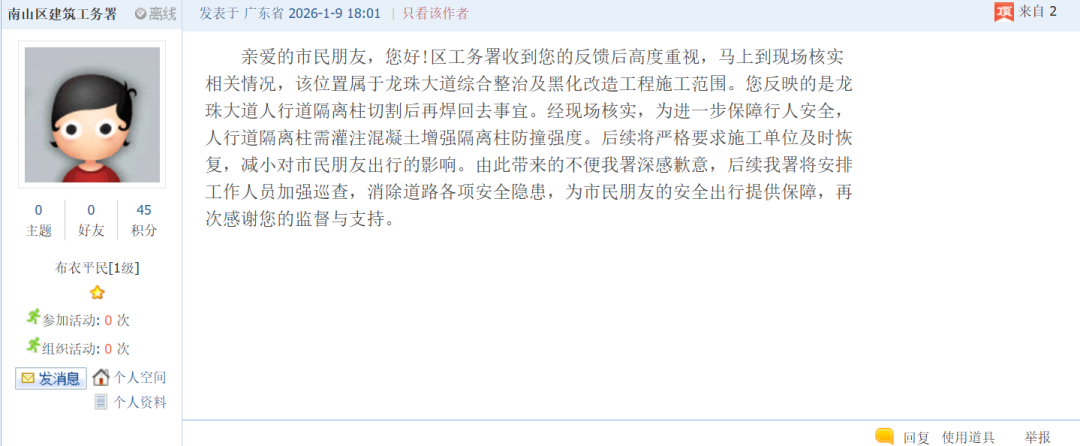 面对公众疑虑,1月9日,深圳市南山区建筑工务署作出正式回应。据其说明,该路段属于“龙珠大道综合整治及黑化改造工程”的施工范围。此次对龙珠大道人行道隔离柱进行切割,是为了灌注混凝土以增强防撞强度,从而进一步保障行人安全。