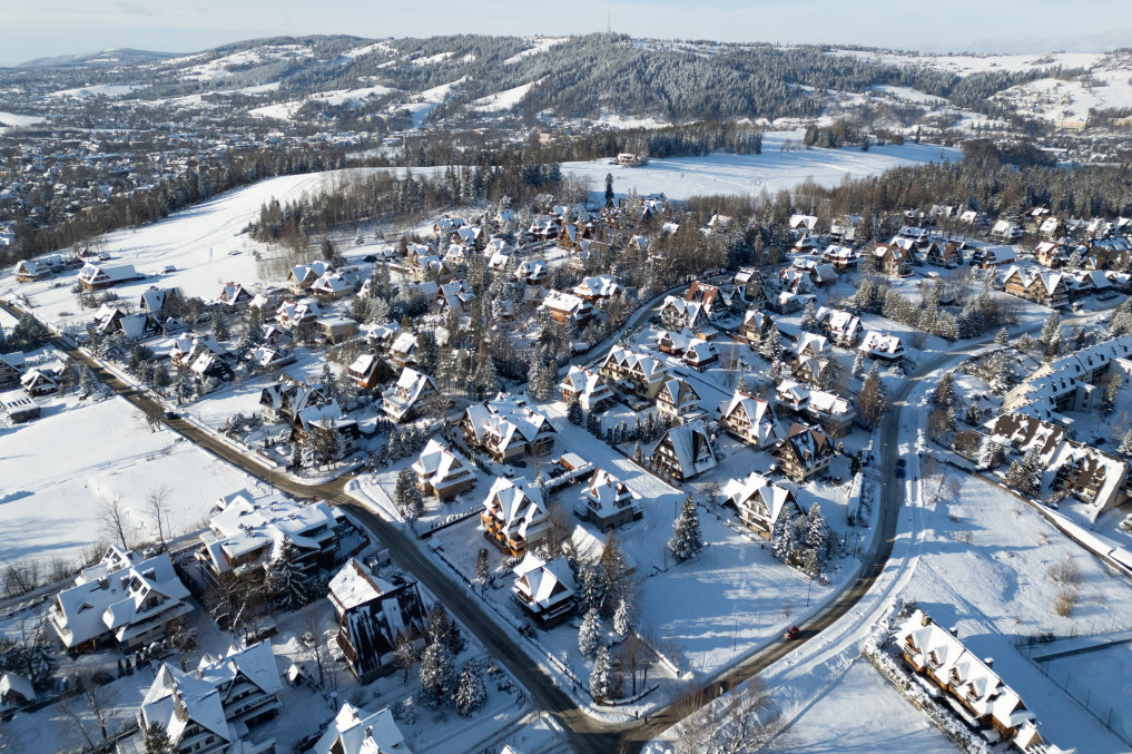 这是1月12日,在波兰扎科帕内拍摄的被白雪覆盖的房屋和山林。