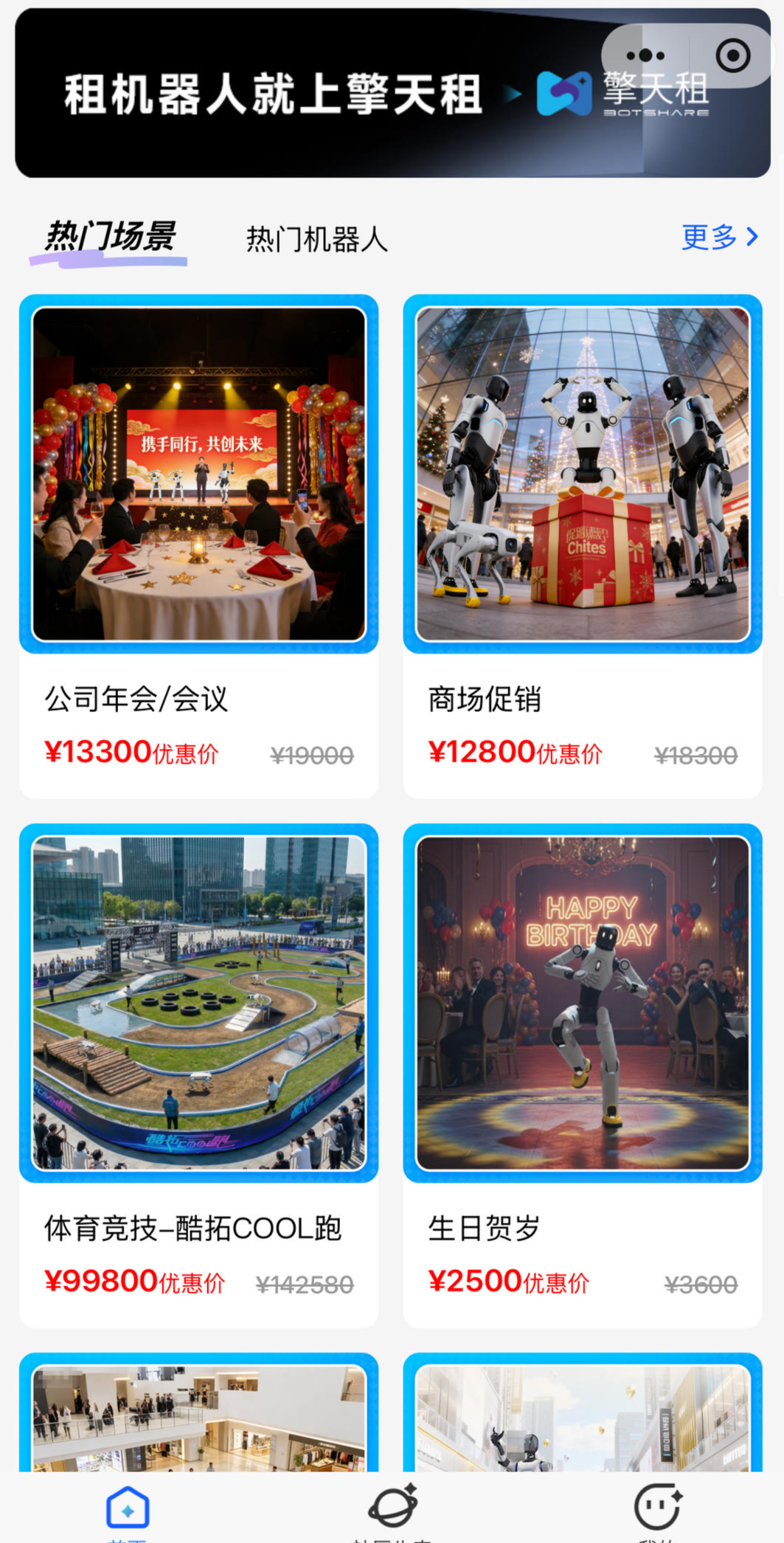 值得一提的是,2025年年末,智园机器人成立擎天租(上海)科技有限公司,推出“擎天租”机器人租赁平台。政事君搜索这个被业内称为“机器人版滴滴”的平台。发现该程序界面显示,其提供的租赁服务覆盖了包括年会、展会、演唱会、体育竞技、婚礼等在内的超过10个具体场景。