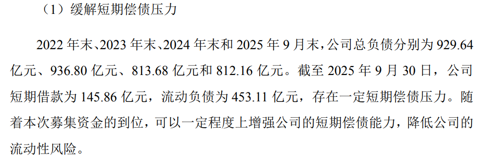 财务数据显示,2022年末、2023年末、2024年末和2025年9月末,新希望总负债分别为929.64亿元、936.80亿元、813.68亿元和812.16亿元,资产负债率分别为68.02%、72.28%、69.01%和69.49%。截至2025年9月30日,公司短期借款达145.86亿元,流动负债453.11亿元。新希望在公告中直言,公司存在一定短期偿债压力。