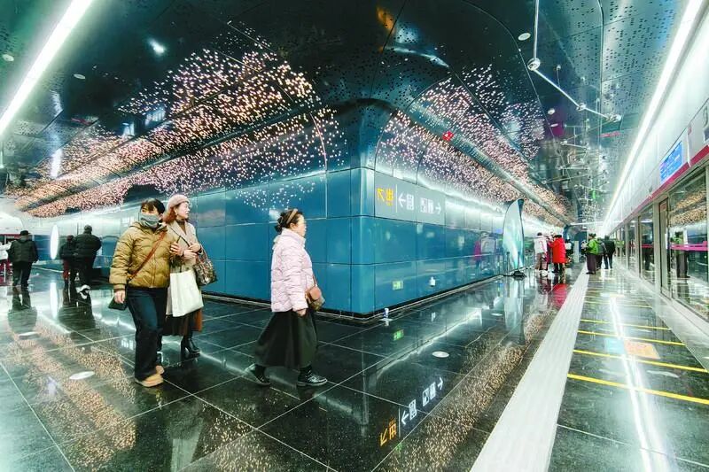 经贸人文交流活力十足,“唐诗之都”建设稳步推进,微短剧产业发展势头强劲……连日来,主流媒体持续聚焦西安多领域取得的新进展新成绩,以一幅幅生动实践图景,展示西安澎湃发展动能。近日,西安地铁15号线皇子坡站成为热门打卡点,独特的设计风格吸引众多市民前来体验。站内深蓝色穹顶缀满“星辰”,搭配航天壁画打造出如梦似幻的乘车环境。图为12日,乘客在皇子坡站内通行。(西安报业全媒体记者 郝钟毓 摄)