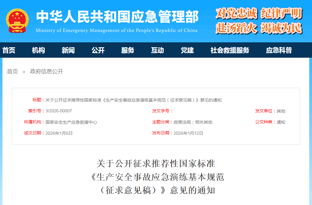 根据国家标准制修订工作安排,国家安全生产应急救援中心组织起草了推荐性国家标准《生产安全事故应急演练基本规范(征求意见稿)》及编制说明(见附件1、2)。《生产安全事故应急演练基本规范(征求意见稿)》在现行推荐性行业标准《生产安全事故应急演练基本规范》(YJ/T 9007-2019)的基础上起草,采用了该现行行业标准的结构框架和主体内容,并主要围绕突出实战实用、强化分类指导等方面做出修改完善。现向社会公开征求意见,此次公开征求意见时间为2026年1月13日至2026年3月14日,反馈意见请填写应急管理标准项目征求意见表(见附件3),并发送至电子邮箱:yjylbz@163.com。
