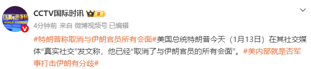 美国总统特朗普今天(1月13日)在其社交媒体“真实社交”发文称,他已经“取消了与伊朗官员的所有会面”。