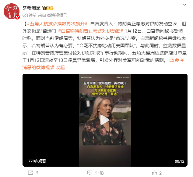 白宫新闻秘书莱维特表示,若特朗普认为有必要,“会毫不犹豫地动用美国军队”。与此同时,监测数据显示,在特朗普政府密集讨论对伊朗采取军事行动期间,五角大楼周边披萨店订单量于1月12日深夜至13日凌晨异常激增,引发外界对美军可能动武的猜测。