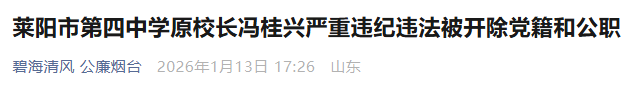日前,经莱阳市委批准,莱阳市纪委监委对莱阳市第四中学原校长冯桂兴严重违纪违法问题进行了立案审查调查。
