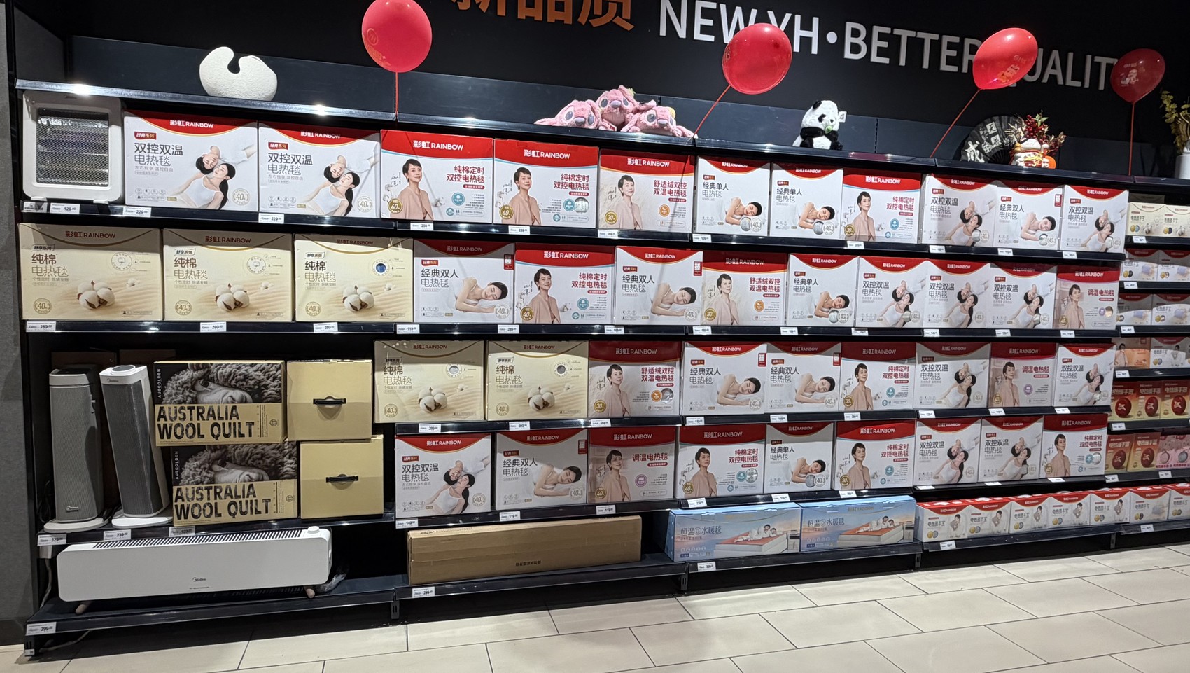 在位于成华区的一家永辉超市里,依然是老牌产品的主场。成都本土品牌“彩虹”电热毯、暖手宝占据了最核心位置,一款售价109元的电热毯仍是走量主力,而价格最高的水暖毯也不过399元。即便如此,传统产品也在努力进行自我升级,货架上的新品几乎都将“除螨”“排潮”作为核心卖点——在湿冷的四川,这是比“取暖”更具体的刚需。
