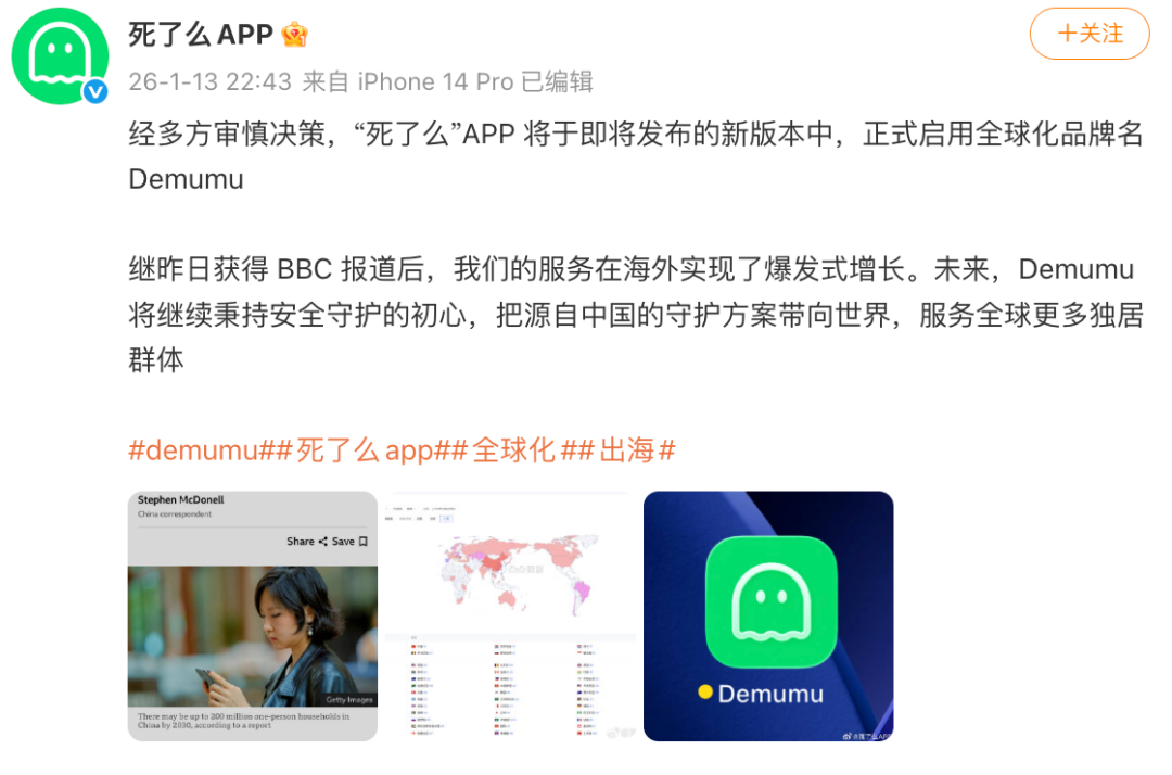 据“死了么”App官方微博消息1月13日晚消息:经团队审慎决策,“死了么”App将于即将发布的新版本中,正式启用全球化品牌名Demumu。