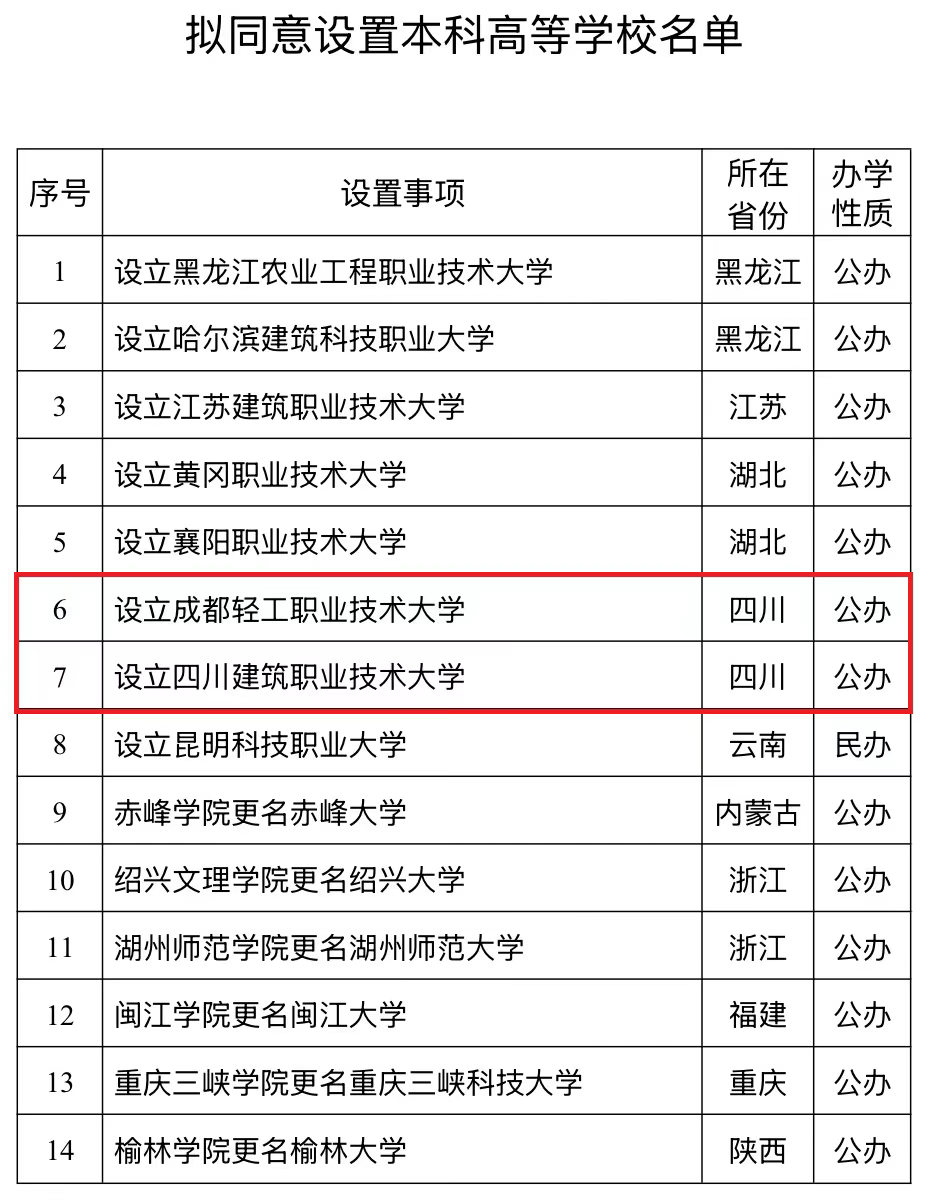 根据《中华人民共和国高等教育法》《普通高等学校设置暂行条例》《普通本科学校设置暂行规定》《本科层次职业学校设置标准(试行)》等有关规定,经教育部党组会议审议,拟同意设置黑龙江农业工程职业技术大学等14所学校,现予公示。