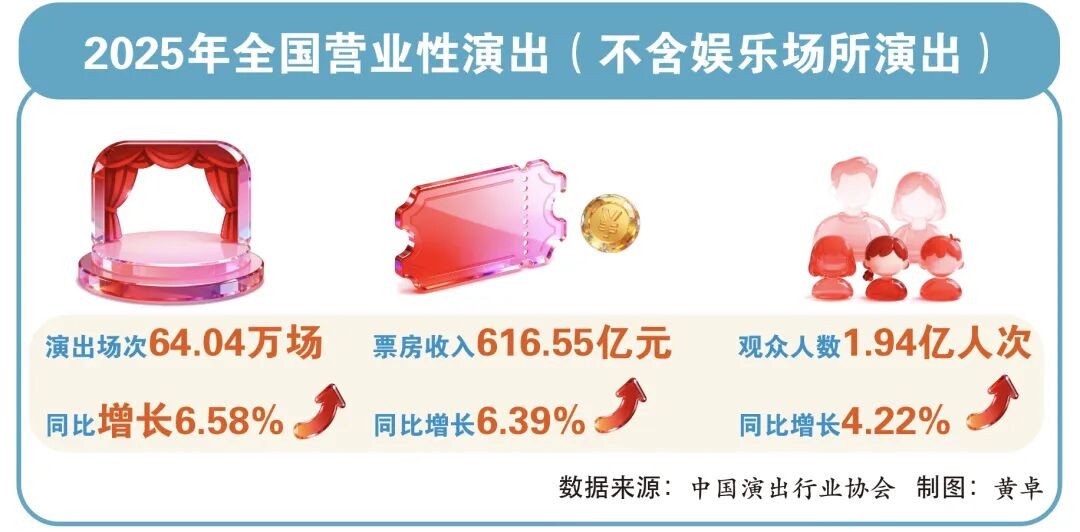1月13日,中国演出行业协会(简称“中演协”)发布2025年全国演出市场简报。据中演协票务信息采集平台监测和调研测算,2025年全国营业性演出(不含娱乐场所演出)场次64.04万场,按可比口径同比增长6.58%;票房收入616.55亿元,同比增长6.39%;观众人数1.94亿人次,同比增长4.22%。2025年全国演出市场呈现出蓬勃向上的发展态势,各类新业态、新场景、新消费模式加速涌现,行业高质量发展的底色愈发鲜明。
