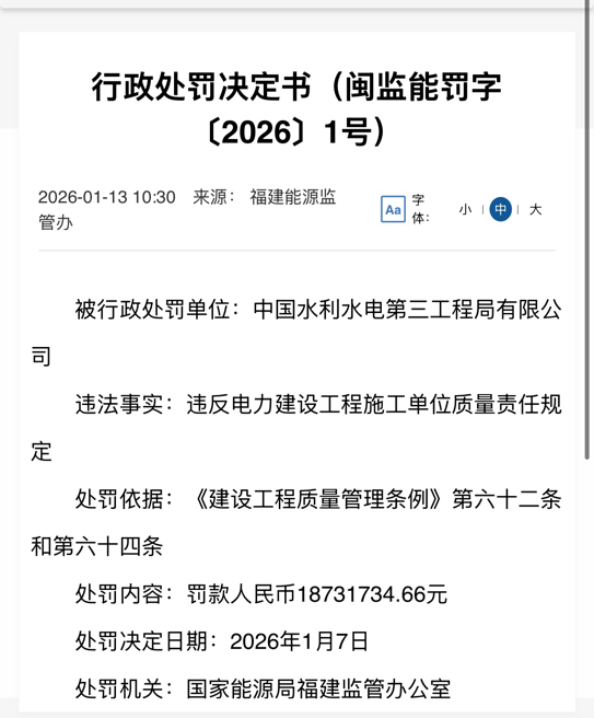 1月13日,国家能源局福建监管办公室发布了三则《行政处罚决定书》(闽监能罚字【2026】1号、2号、4号),福建永安抽水蓄能电站的施工、业主、监理三家单位合计被罚超1978万元。