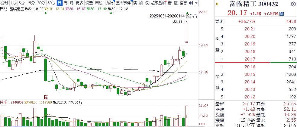 受利好消息推动,富临精工1月14日大幅高开后继续冲高,股价在盘中最高涨幅一度超过18%,虽然之后涨幅有所回落,但截至收盘涨幅仍高达7.92%。