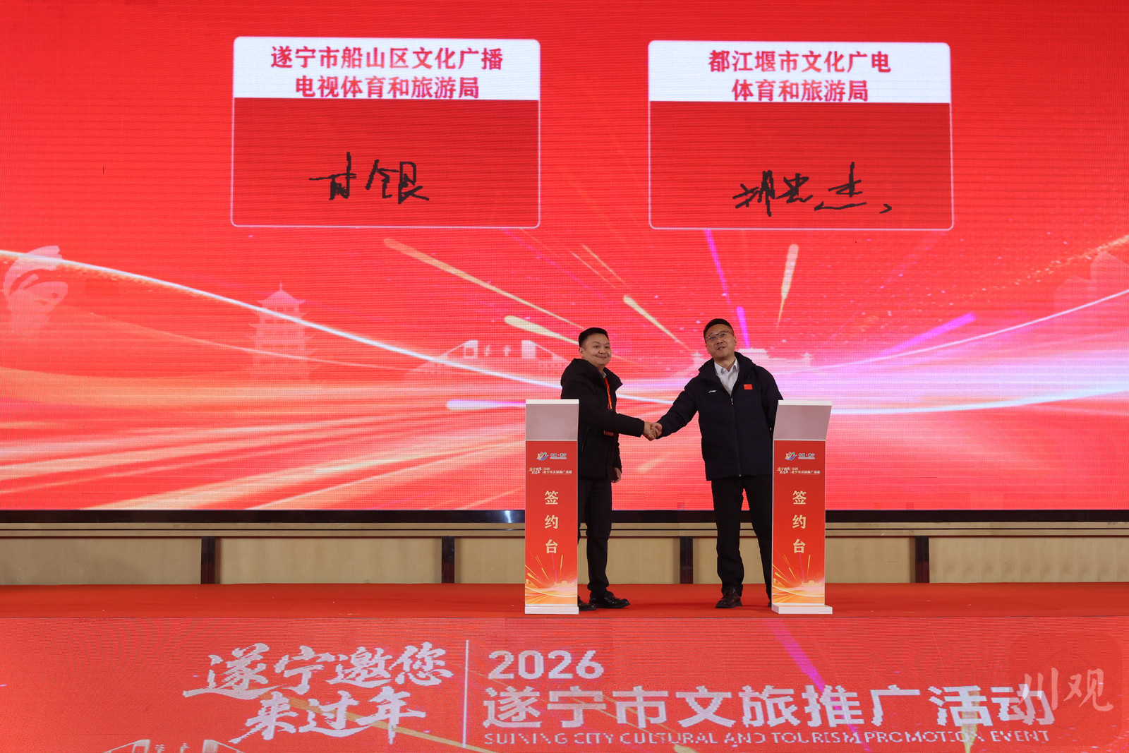 活动现场,遂宁与乐山、船山区与都江堰市分别签订文旅合作框架协议,推动旅游资源共享、客源互送。同时,多家遂宁本地旅行社与境内外合作商分别签约,进一步拓展遂宁入境游市场。