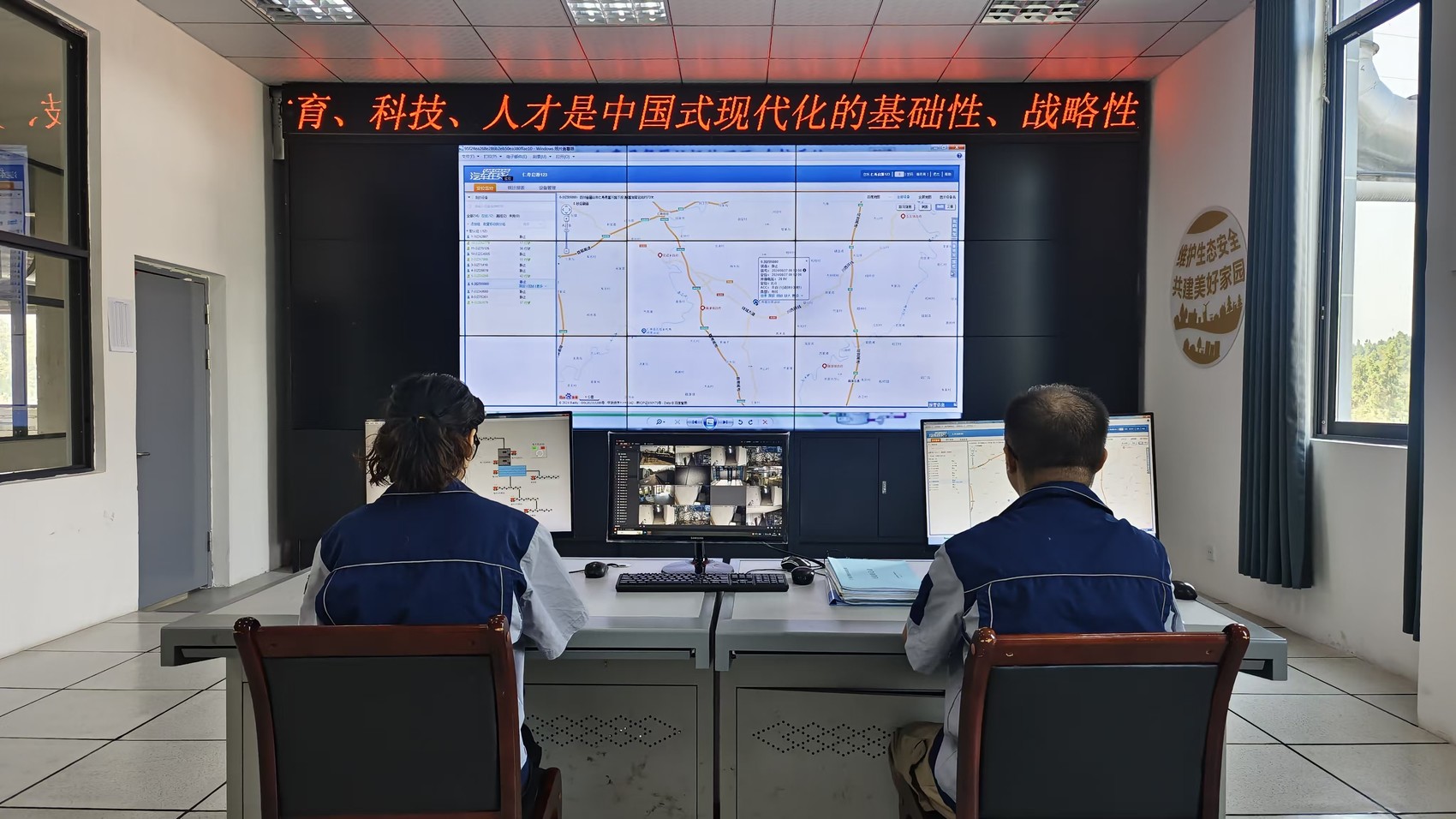 餐厨垃圾处理厂中控室,工作人员正在实时监控餐厨垃圾收运车运输情况。受访单位供图。