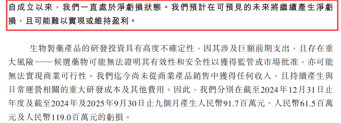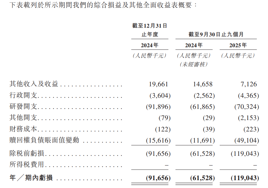 财务数据显示,2024年度公司净亏损9165.6万元,2025年前三季度净亏损进一步扩大至1.19亿元,主要由于研发开支及赎回权负债账面值变动所致。现金流方面,经营活动现金净流出持续扩大,2024年为7886.5万元,2025年前三季度增至8407.5万元,资金主要用于研发及行政活动。