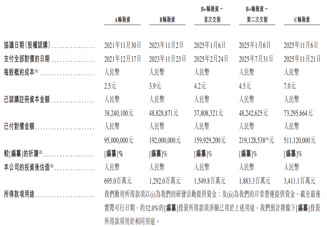截至2025年11月30日,公司持有现金及现金等价物及按公允价值计入其他全面收益的债务投资共计7.28亿元,为后续研发与运营提供了支撑。在2025年11月完成的最近一轮C轮融资后,公司估值已达34.11亿元。