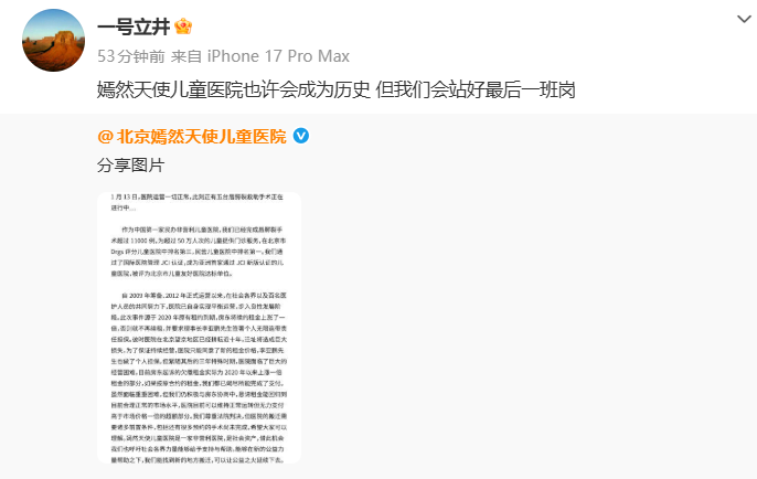 1月13日,李亚鹏@一号立井 转发北京嫣然天使儿童医院发布的关于北京市朝阳区嫣然天使儿童医院关于房租债务的回应,并配文称“嫣然天使儿童医院也许会成为历史,但我们会站好最后一班岗”。