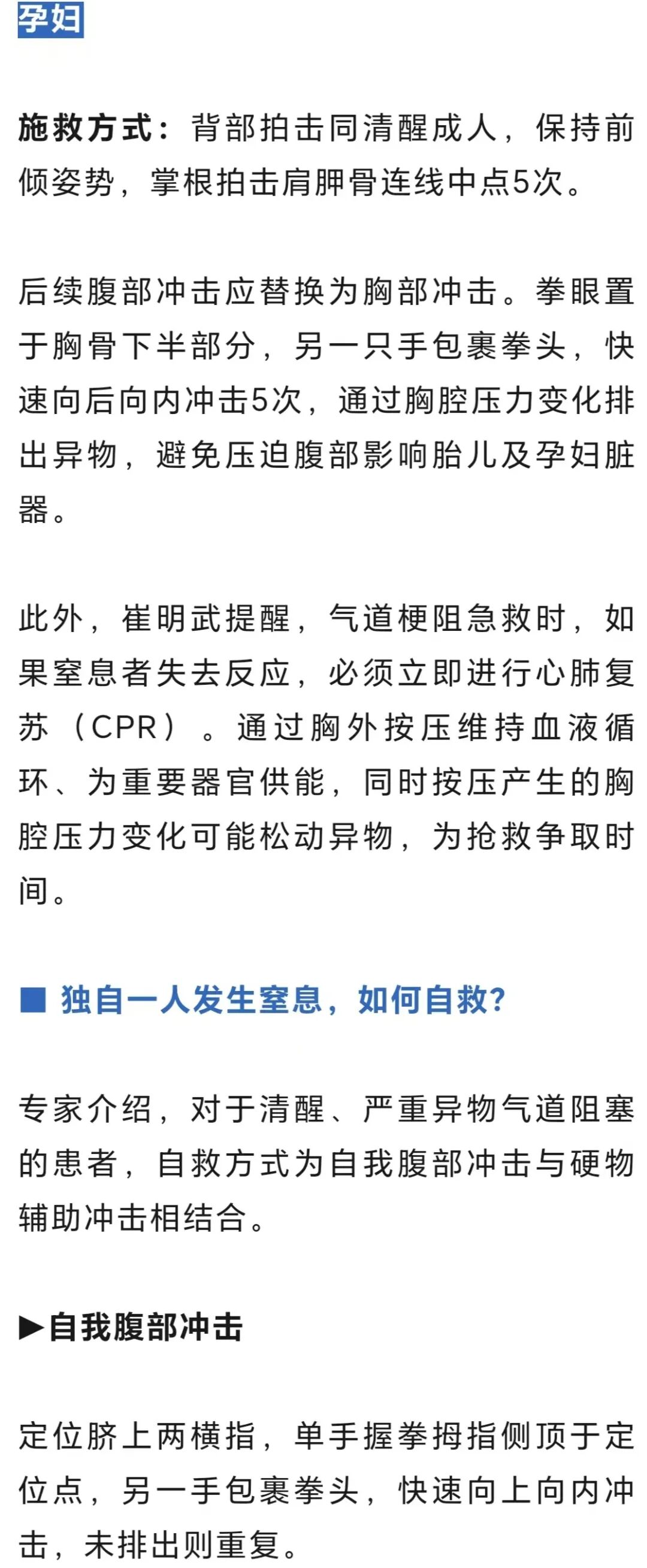专家提醒,急救方法本质是为挽回生命而创,在日常生活中应保持“预防大于急救”的理念。对于婴幼儿、老人等人群,应尽量把食物切成小块,充分咀嚼后下咽。吃饭时保持专心、情绪平稳,减少异物卡入气道的可能。