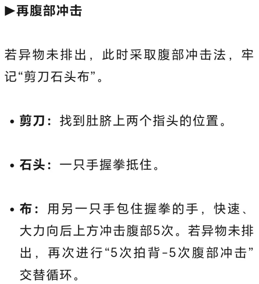 可将上腹部抵住椅背、桌子边等坚硬边缘,身体前倾,快速向内、向上挤压腹部,利用反作用力产生腹内压冲击异物。
